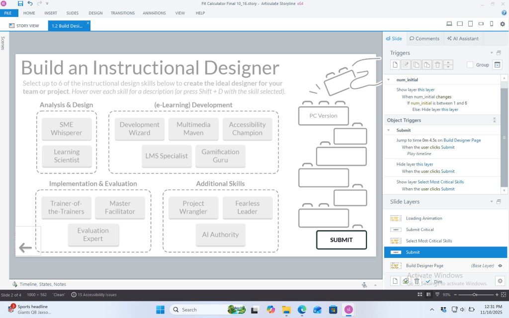 The Fit Calculator was my first “e-learning” development project, designed to demonstrate my proficiency with Articulate 360 Storyline while also encouraging me to reflect on my instructional design skills and experience. Although not a traditional e-learning course/module, its development provided me with ample opportunity to explore Storyline’s capabilities—from the basics to its more advanced tools and features.