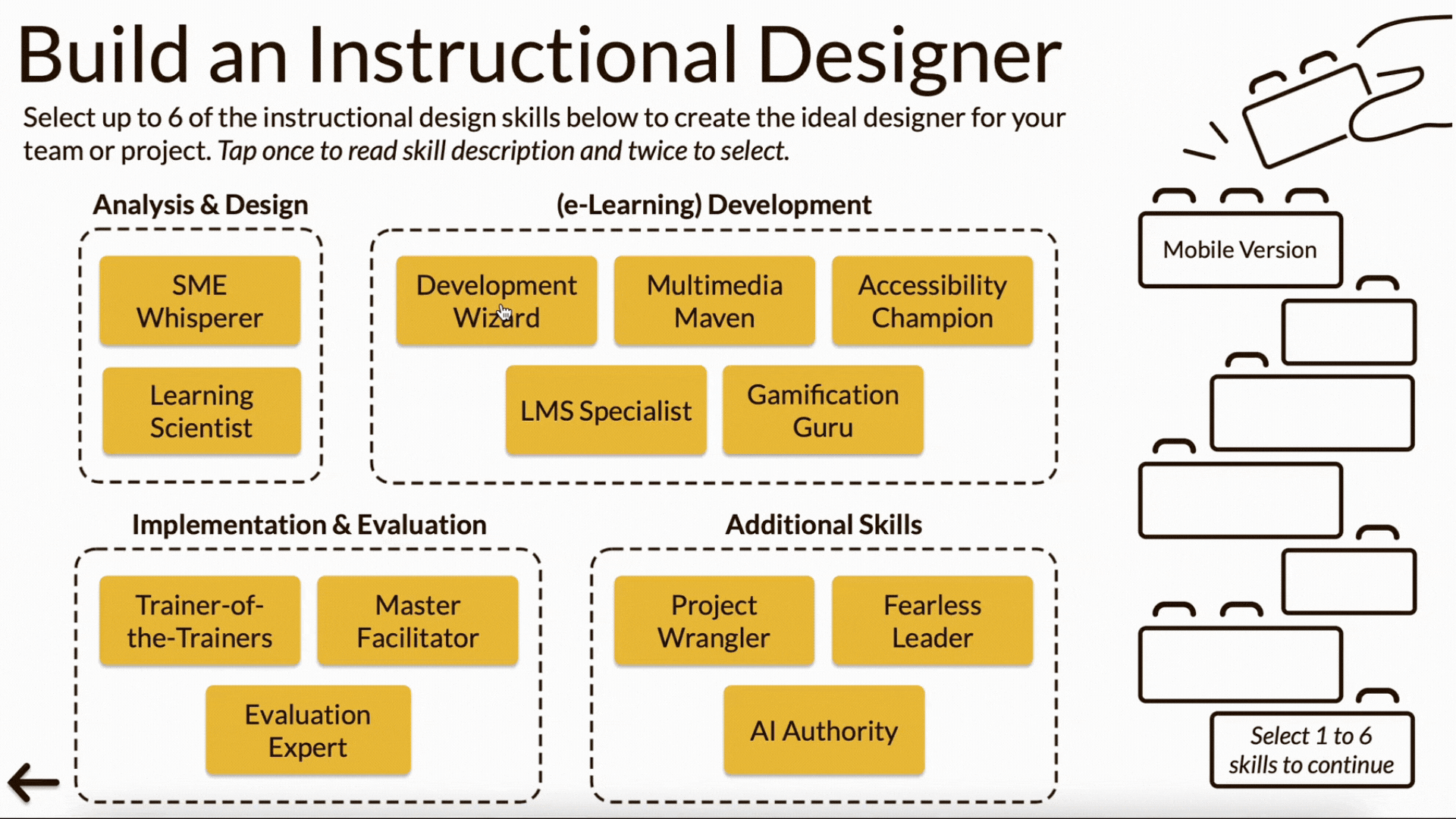Compile a list of top instructional design skills (based on job descriptions and other research); visually organize skills by steps of the A.D.D.I.E. model to facilitate skill browsing/selection.