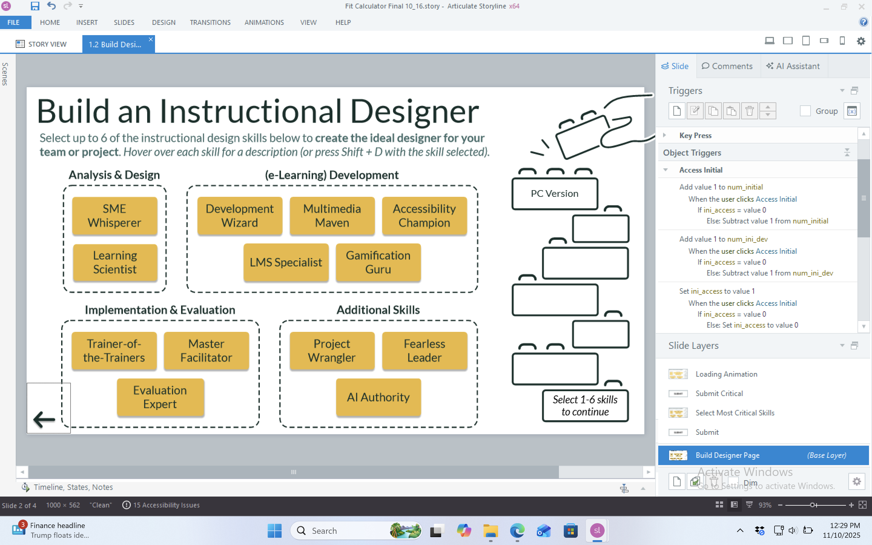 - Accessibility challenges. I needed a way to display all of the skills (and skill descriptions) on one page, while keeping the buttons and text large enough to be accessible on mobile devices. My solution was to deactivate the Storyline player to maximize screen real estate and use hover states to display skill descriptions. Only much later did I discover that 1) deactivating the player also removes access to the accessibility controls menu and 2) hover states don’t work on mobile devices/are inaccessible to screen readers and keyboard users (see Step 2 for my creative solutions to these challenges).